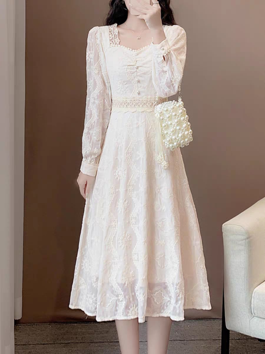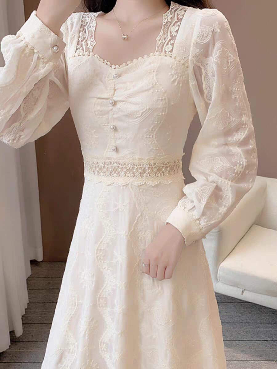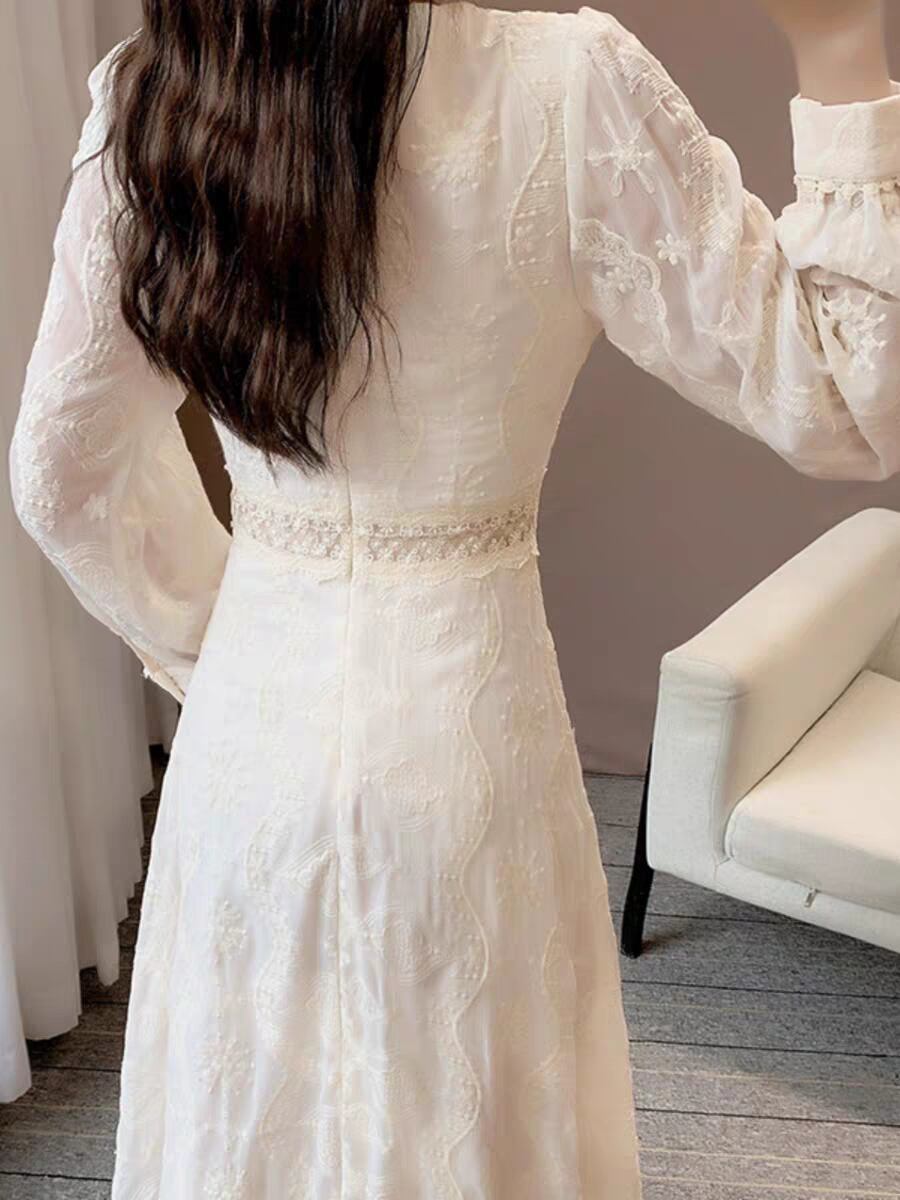 ふんわり広がる白生地に上品フリルを添えた、清楚で可愛いハートネックドレス。