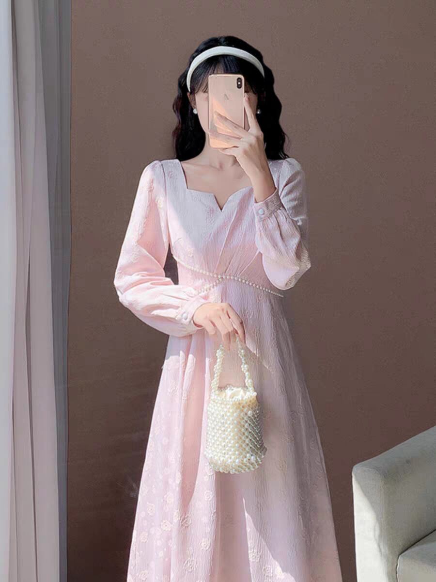 パール付き春ピンクワンピース|ウエスト細見え×初恋フェミニン