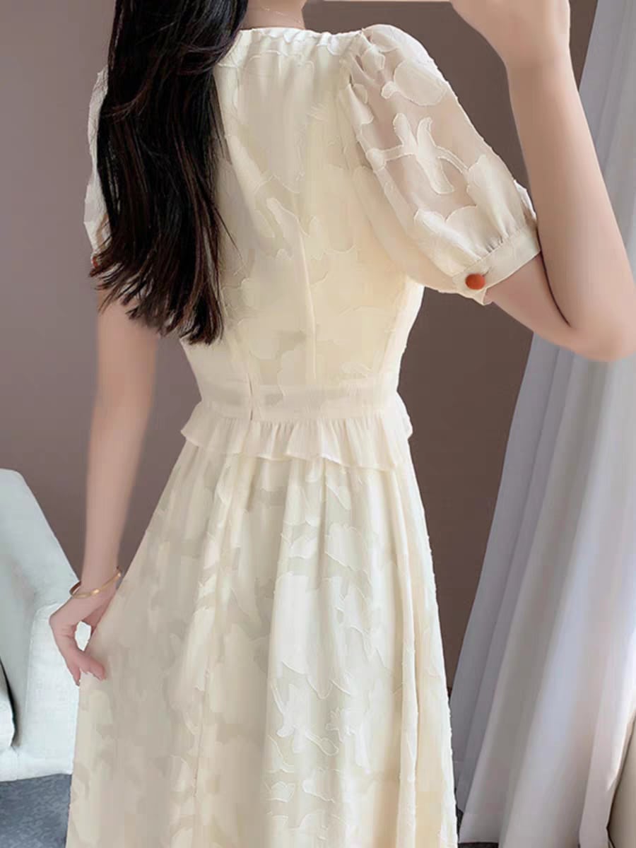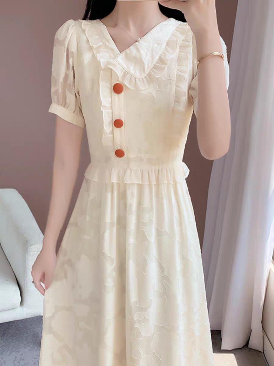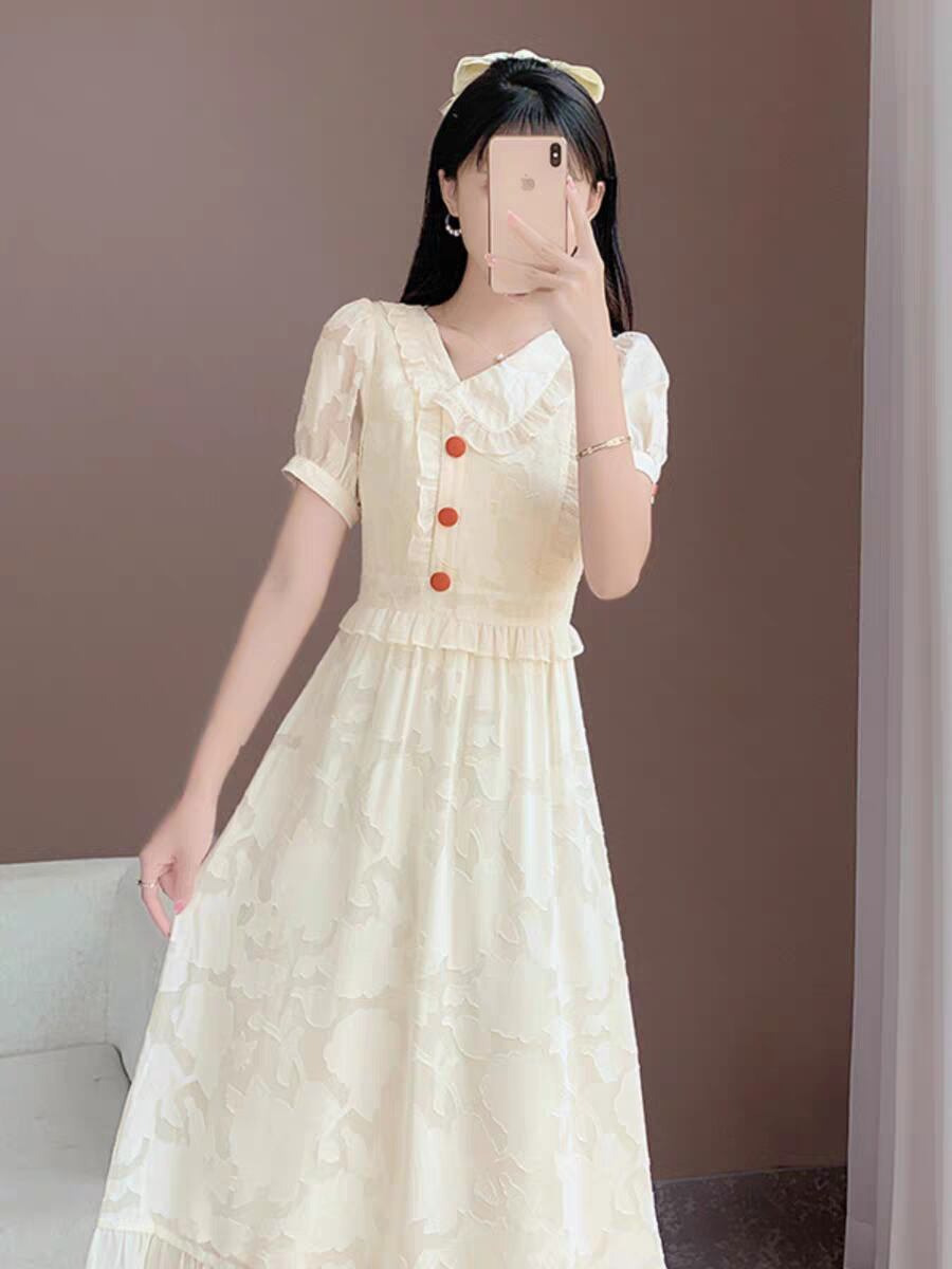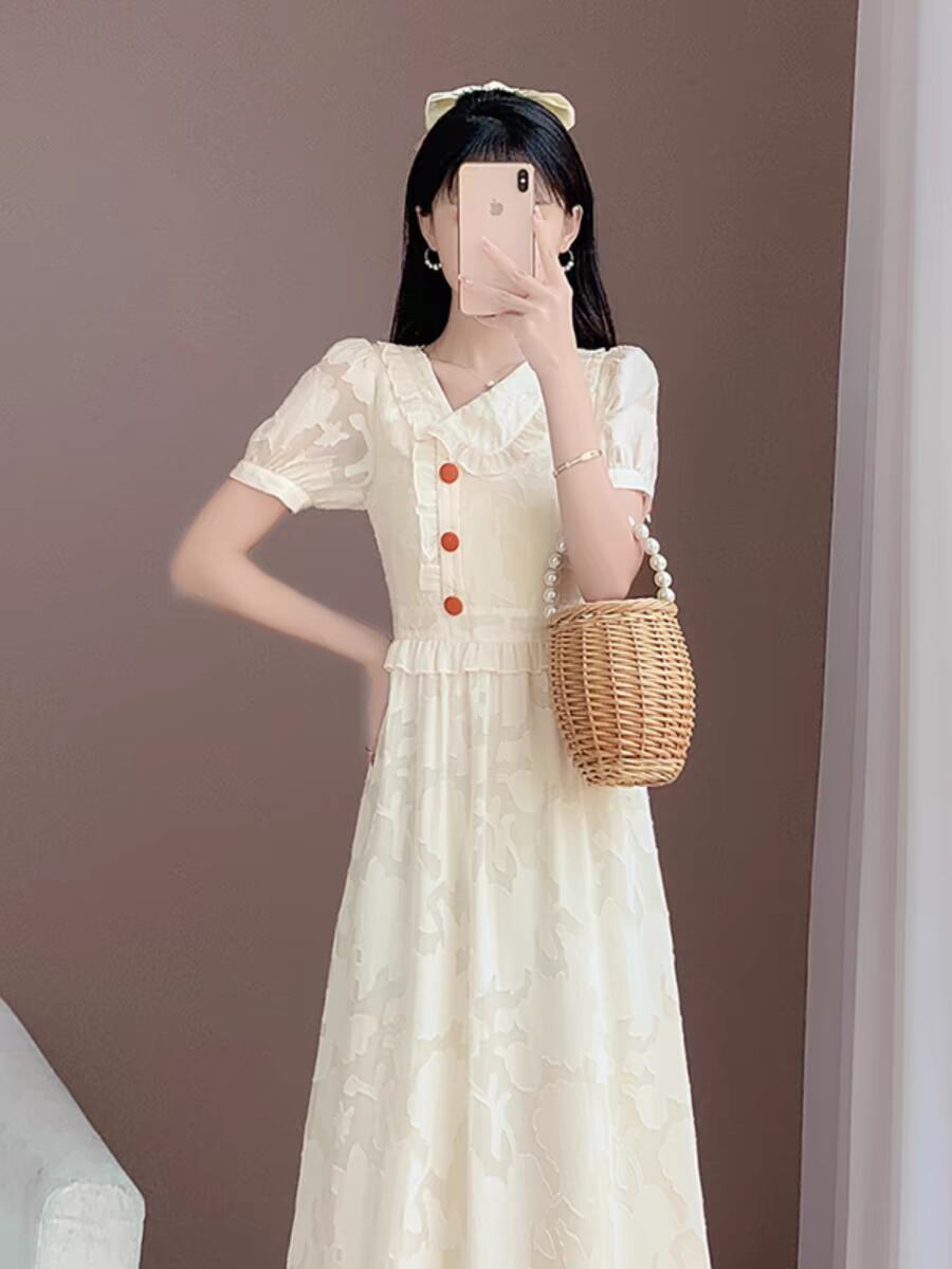 赤ボタンがときめくレースロングワンピ|白で魅せる清楚フェミニン