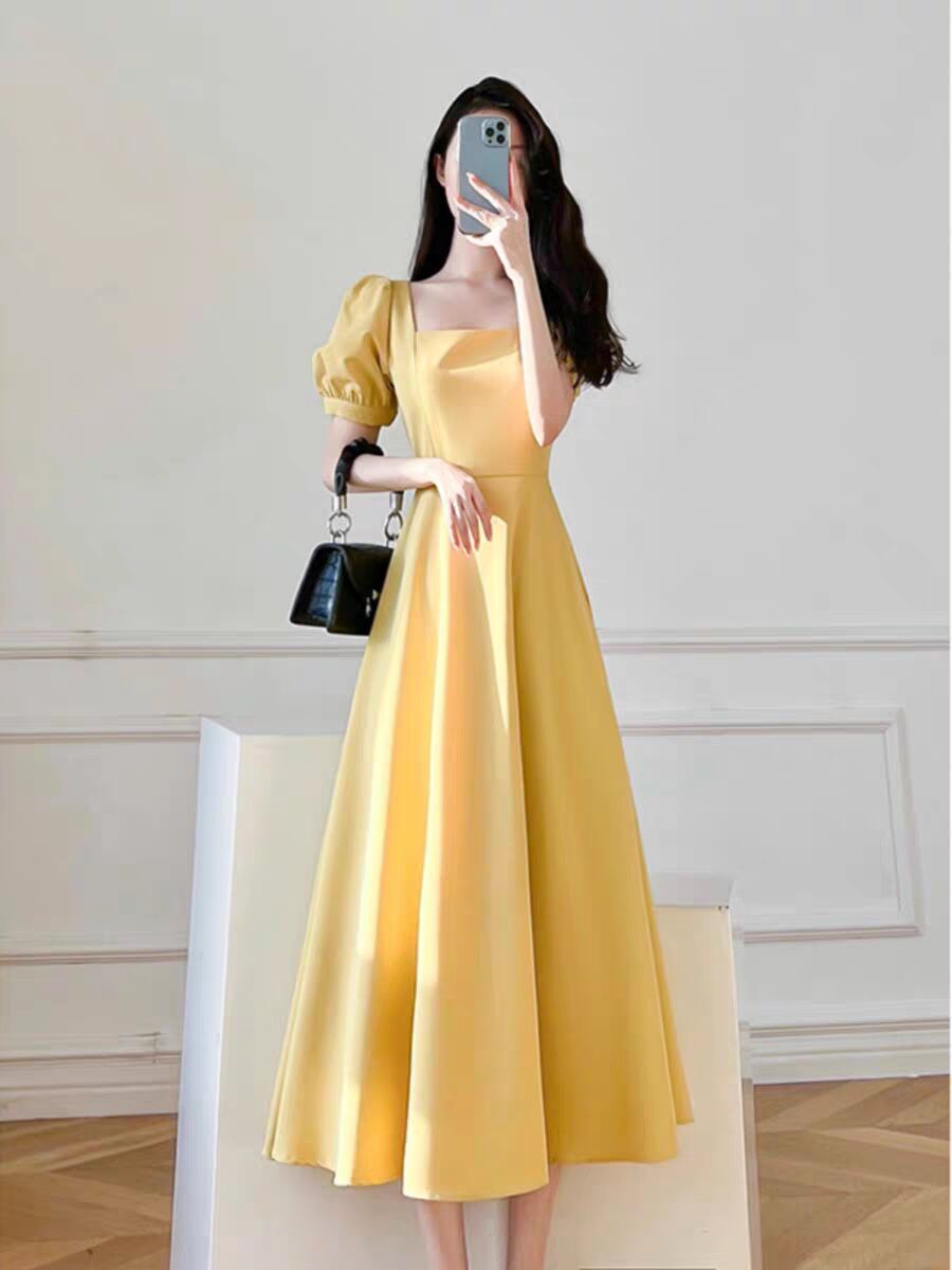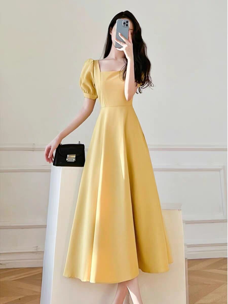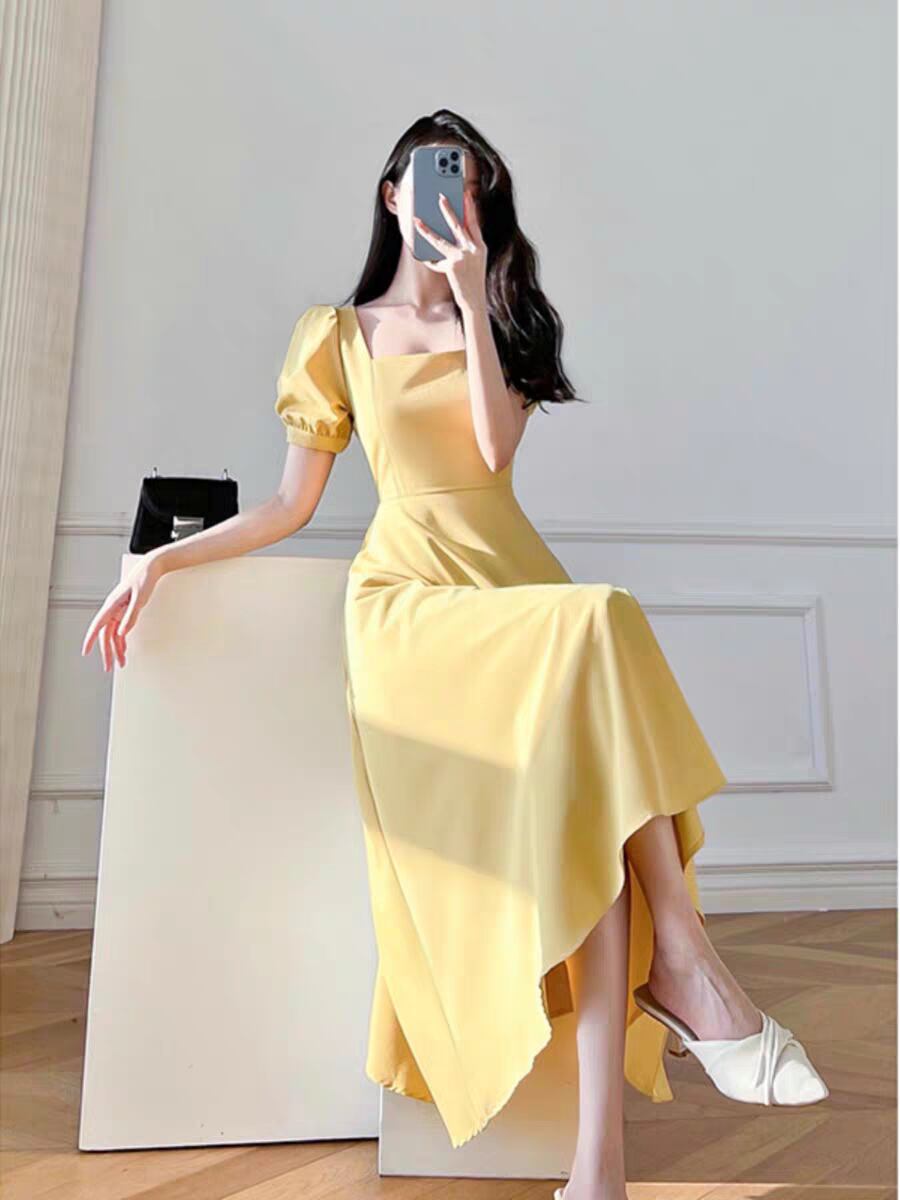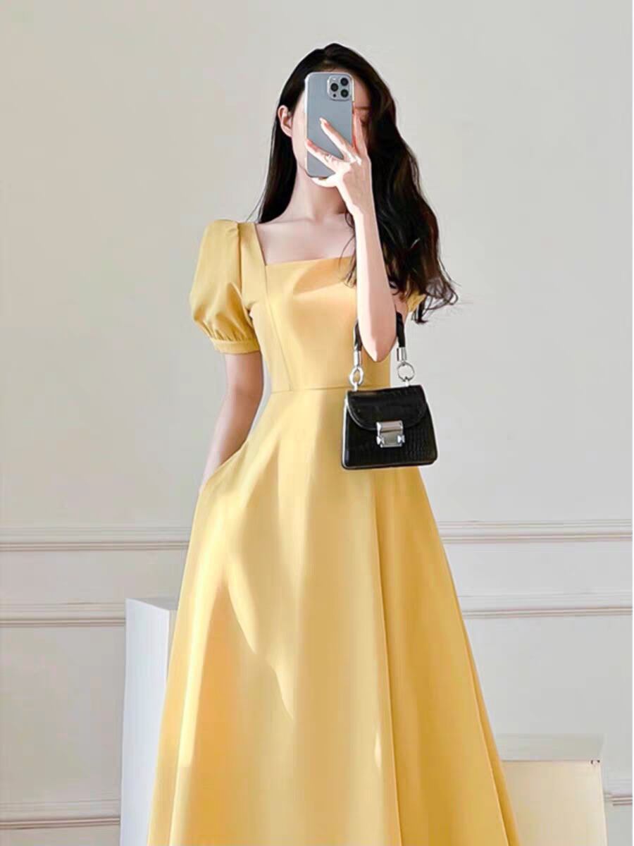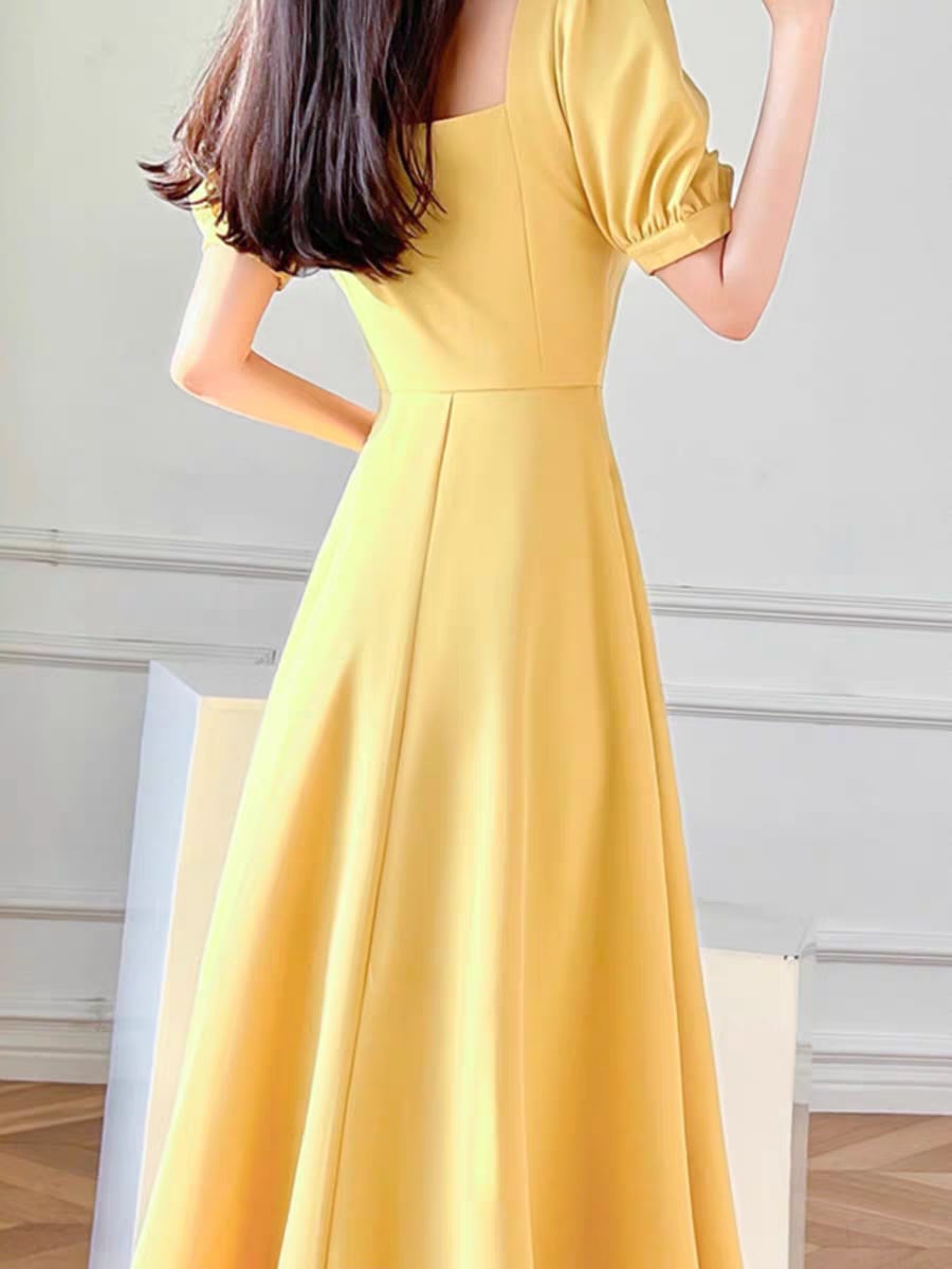 イエロー鎖骨見せロングワンピース|夏 大人可愛い 体型カバー