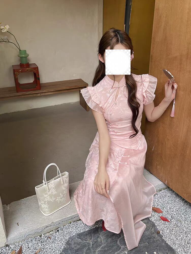 優しいピンクカラーと軽やかなシフォン素材で、涼しく快適に着こなせるチャイナ風デザイン。