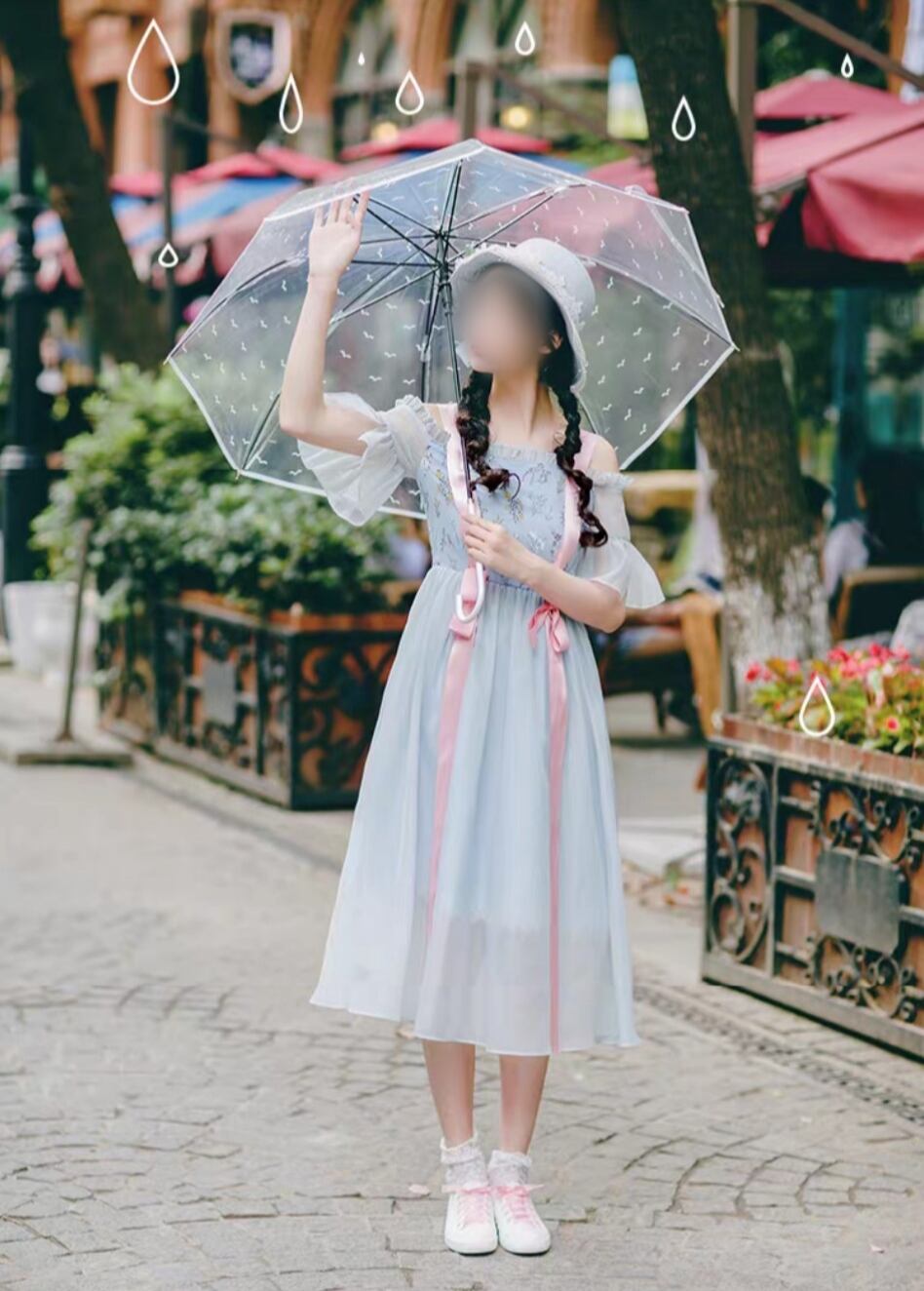淡いミストブルーに映えるピンクリボンが愛らしい、夏の主役ワンピース。