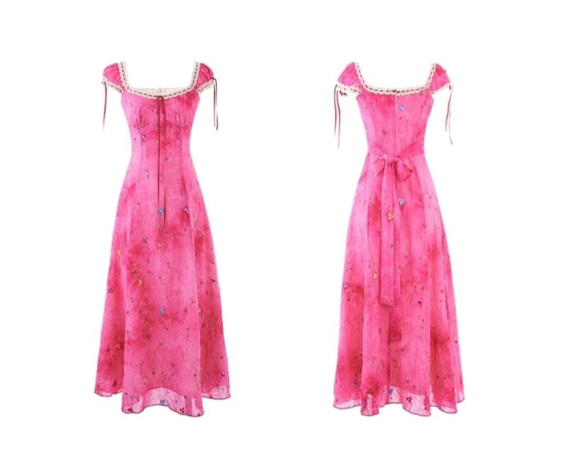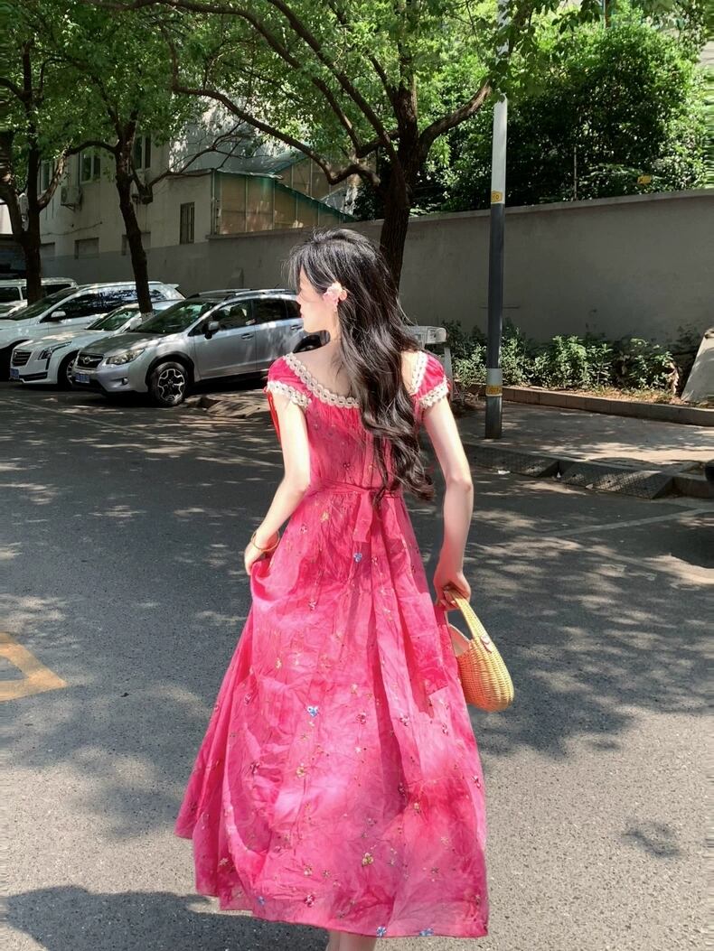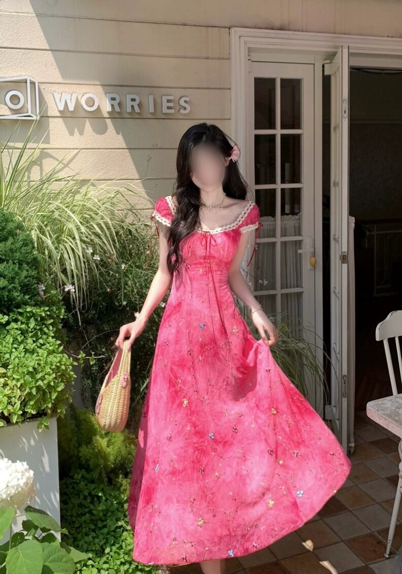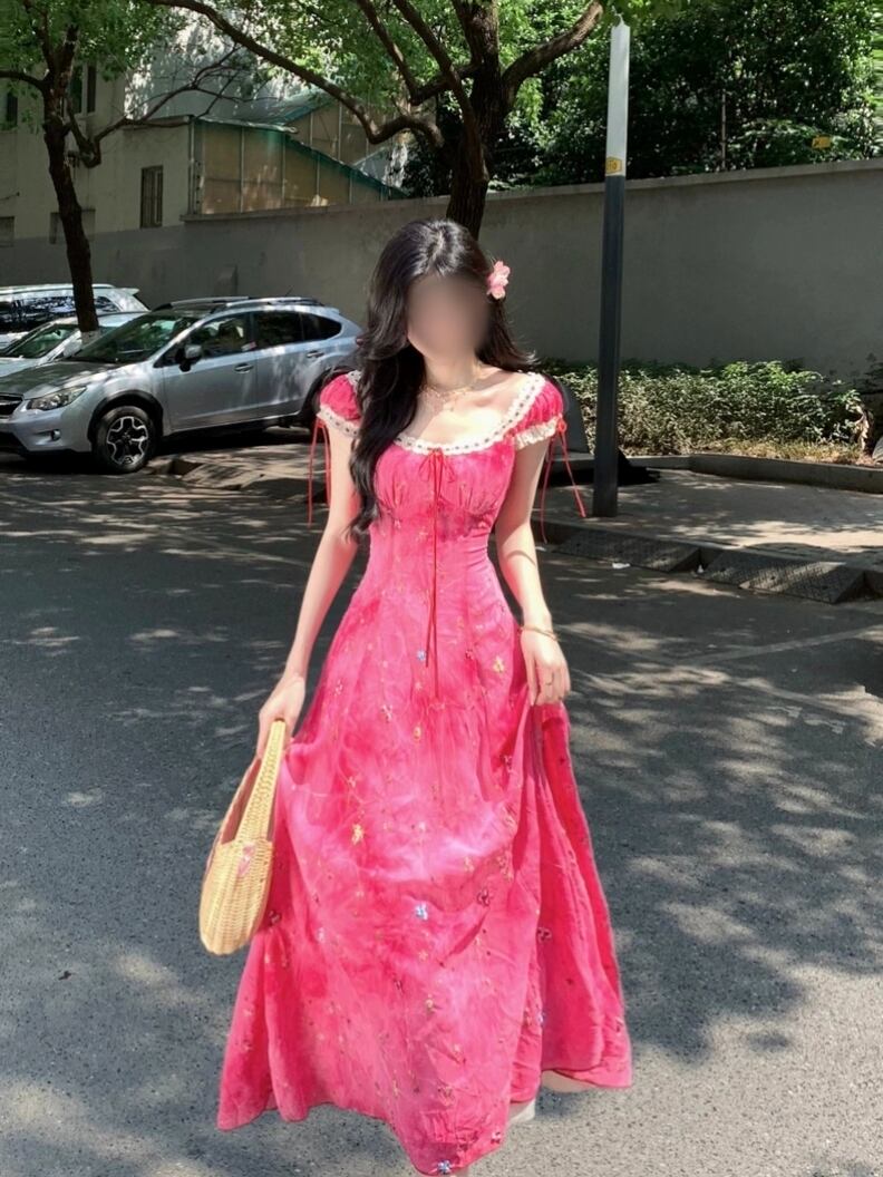 ピンクレッド ロングワンピース ビーチ リゾート 大人可愛い 肌映え