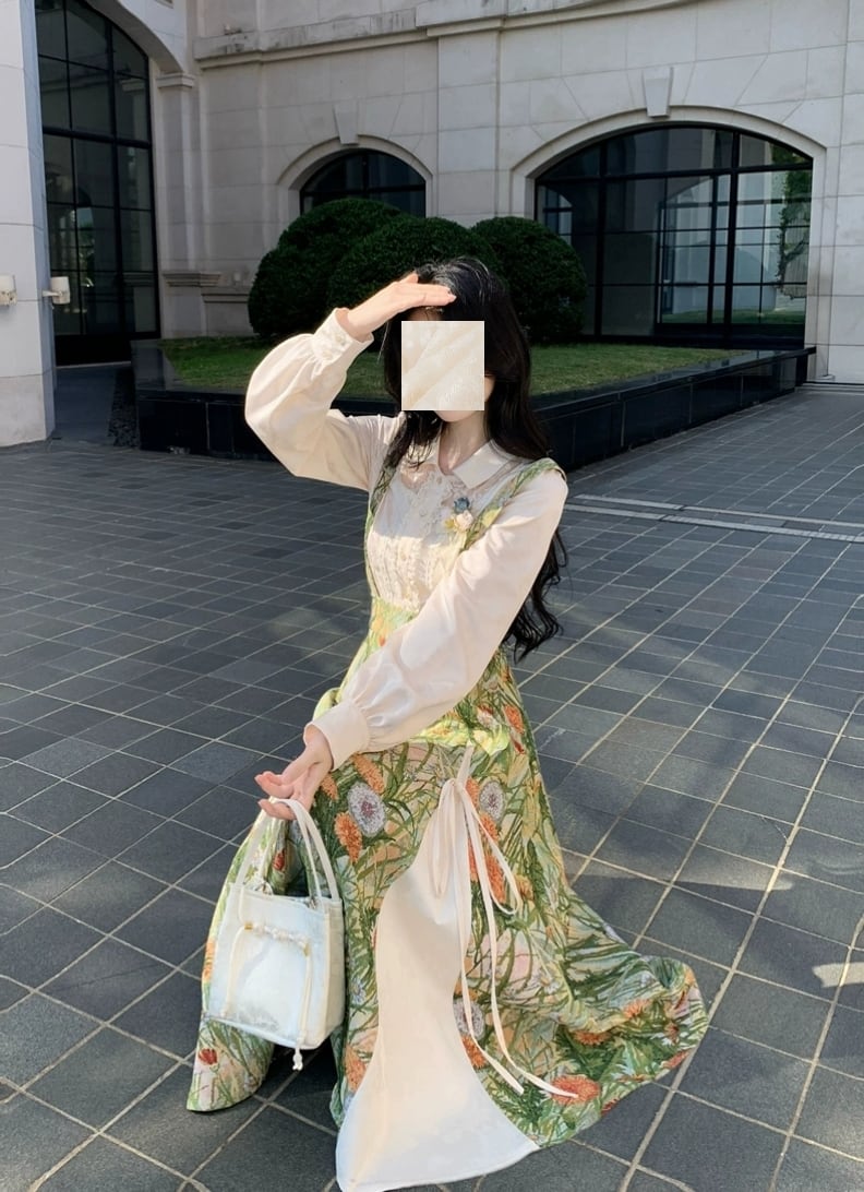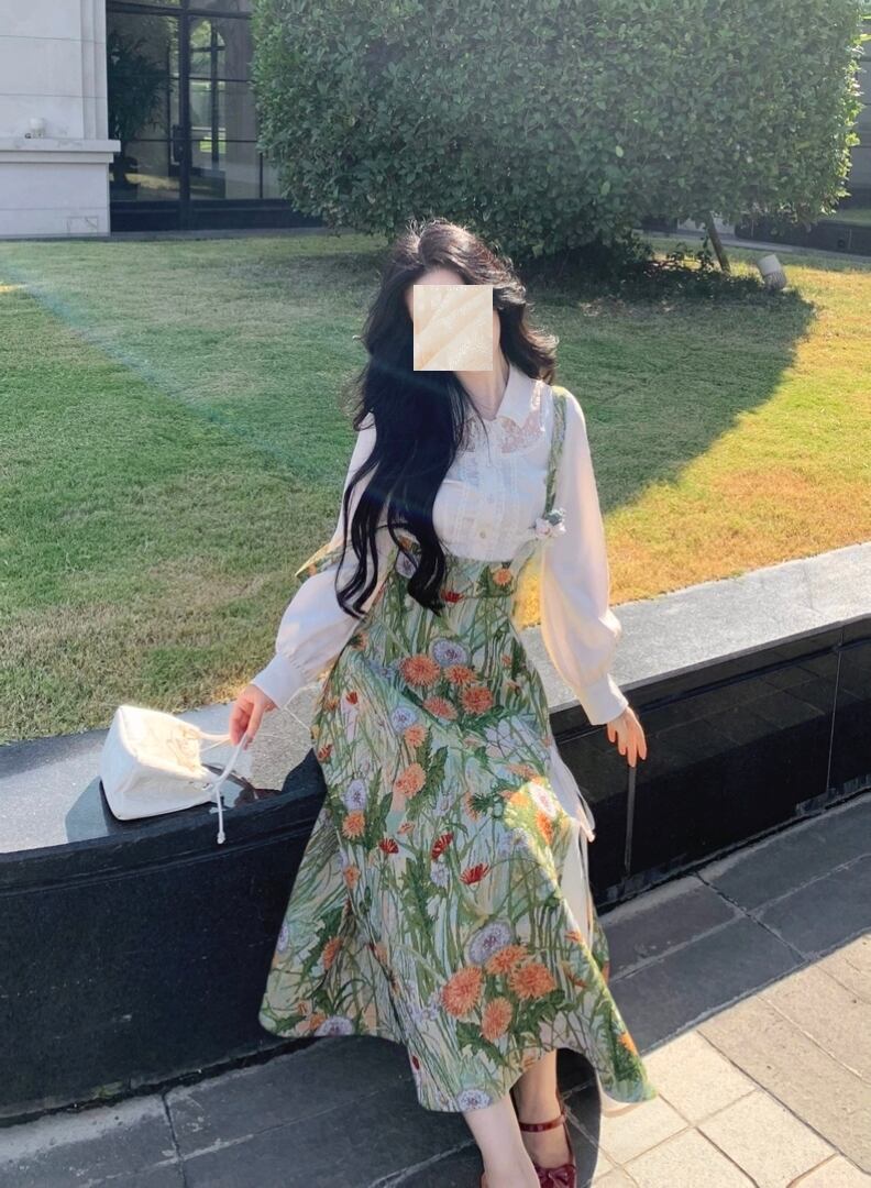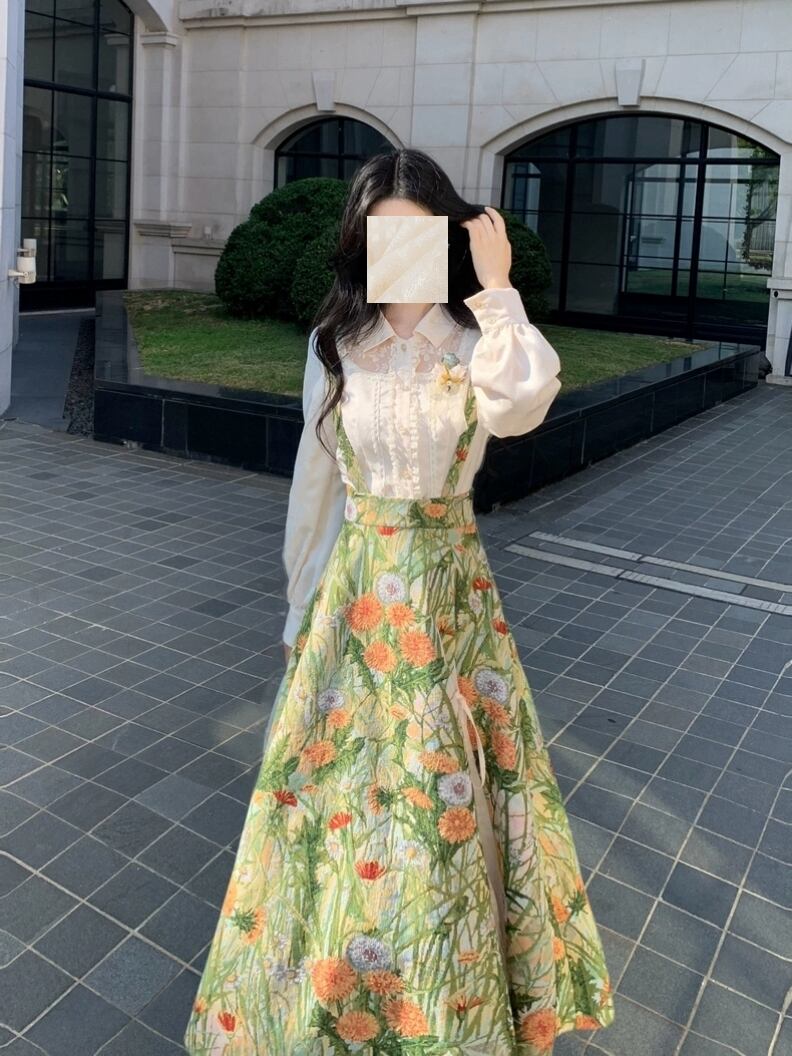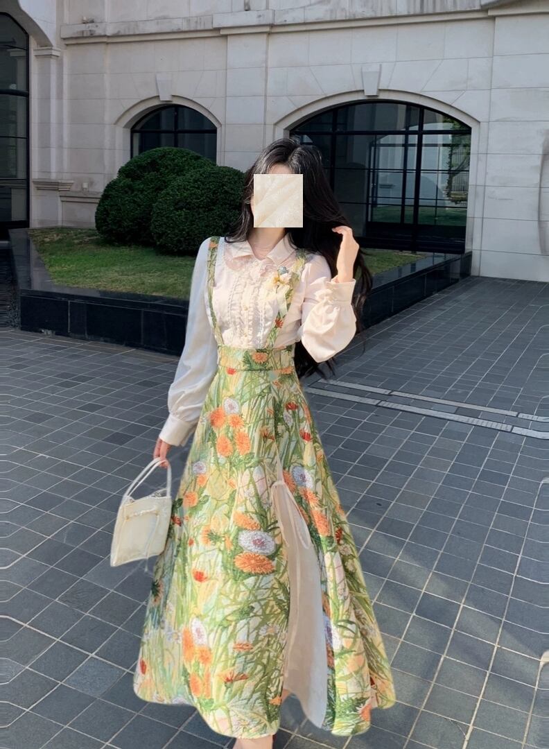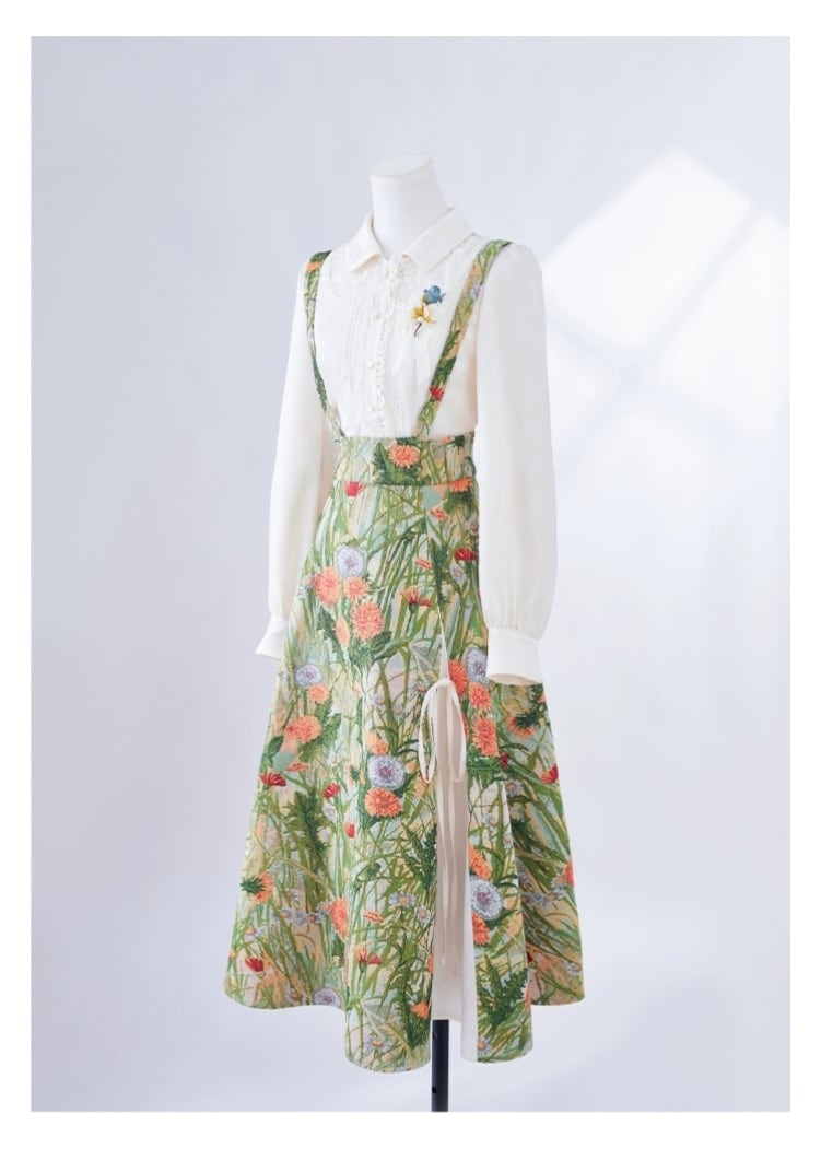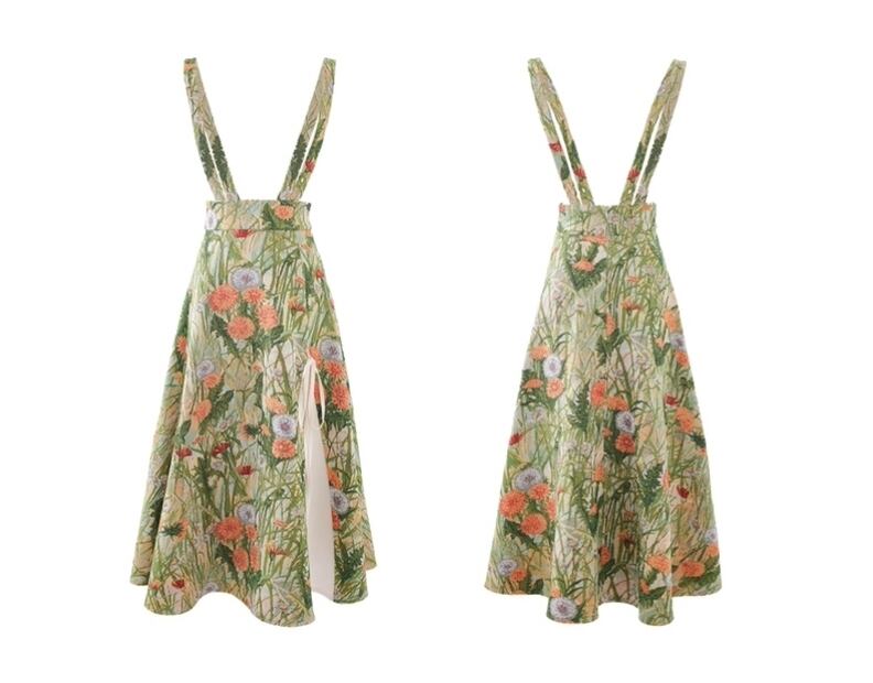 秋色ライトグリーンサスペンダー|フレンチレトロ高腰スカート