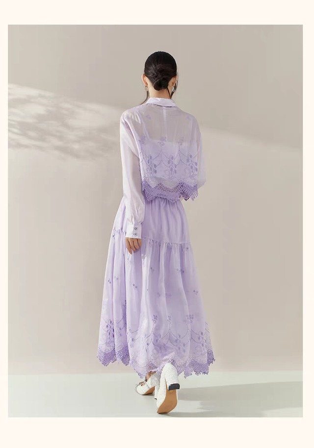 【セットアップ】パリの花園レースセットアップ|ラベンダーシャツ×フレアスカート