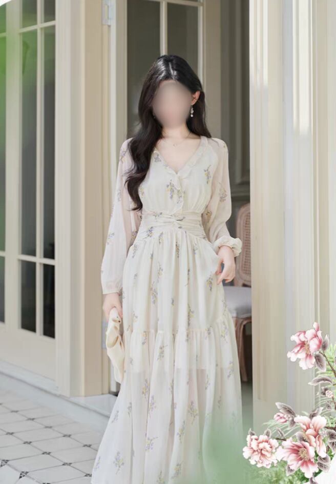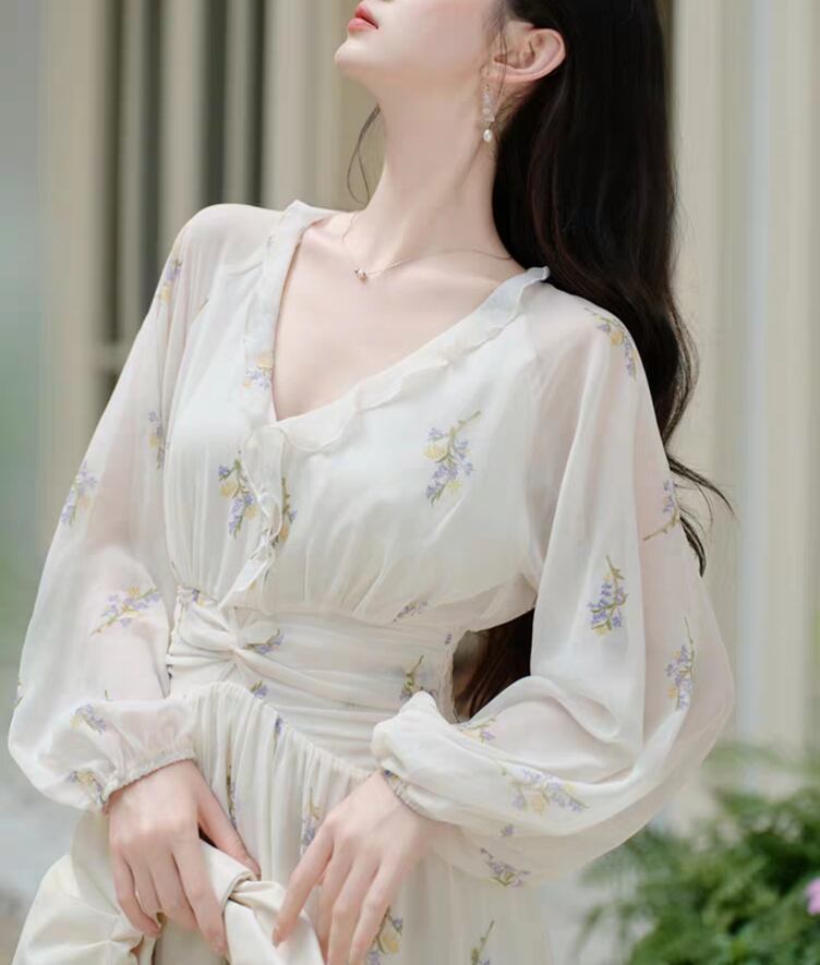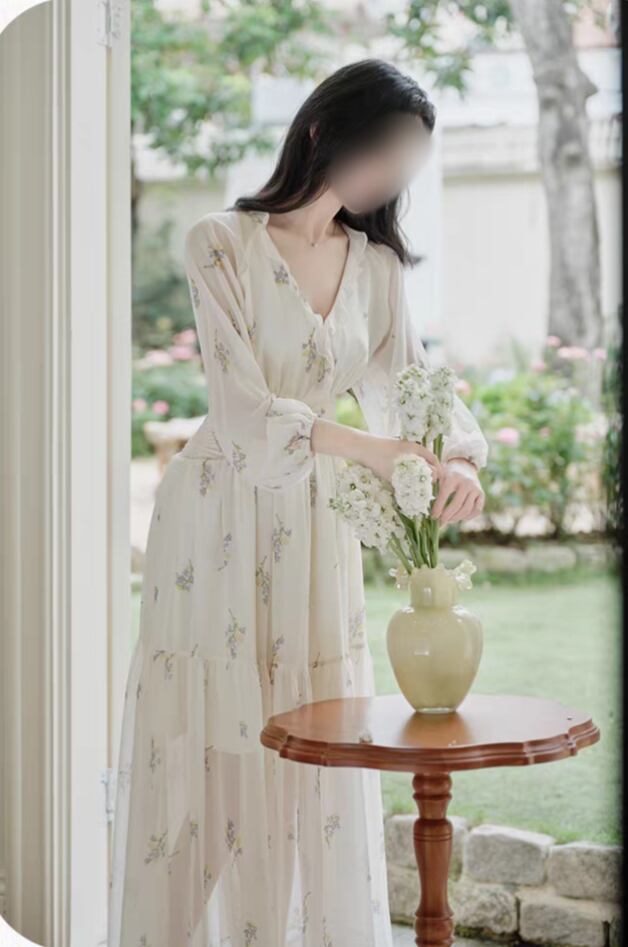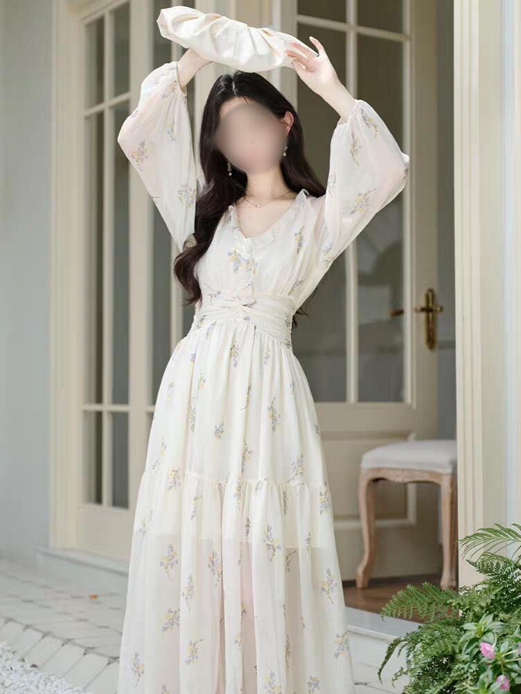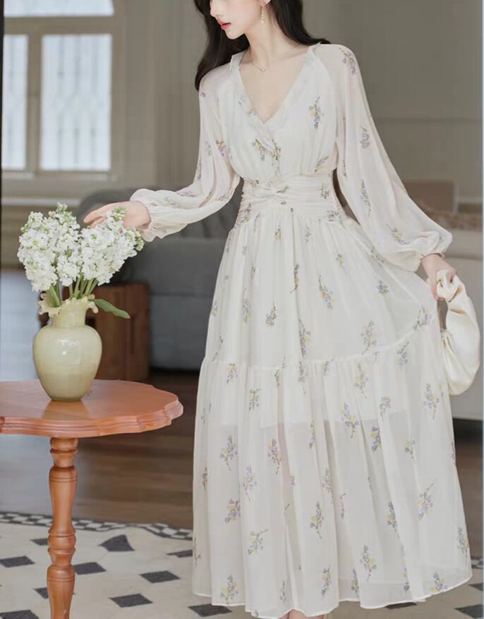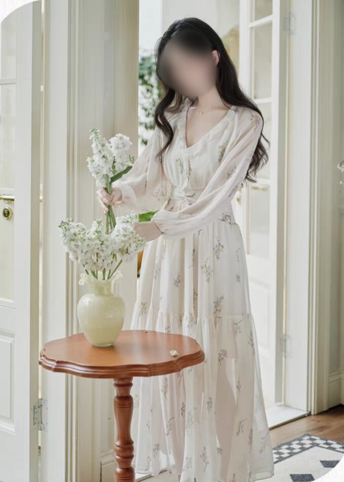【春夏新作】花柄シフォンロングワンピース|Vネック・ハイウエスト着痩せ・フェミニン