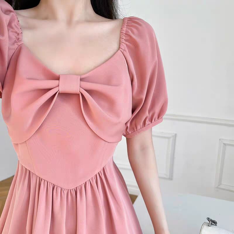 胸元 大きいリボン 無地ピンクロングワンピース